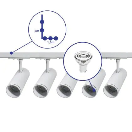 Komplettset 1-Phasen Rail L 1,5 x 2 Meter Weiß | incl. 5x Spot + GU10 2700K 3W Dimmbar + Abschlusskappe, Stromanschluss und L -Verbinder