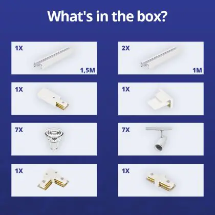 | Herstellername | Complete L shaped 1-Phase Track Set White incl. 7x Spot fixture + GU10 2700K 3W Dim – 1.5 x 2 meters | |