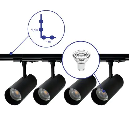 Komplettset 1-Phasen Rail L 1 x 1,5 Meter Schwarz | incl. 4x Spot + GU10 2700K 3W Dimmbar + Abschlusskappe, Stromanschluss und L -Verbinder