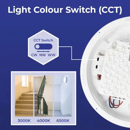 2. CCT : Vous choisissez parmi 2 ou 3 couleurs définies à l'aide d'un interrupteur, comme le blanc chaud ou le blanc froid.